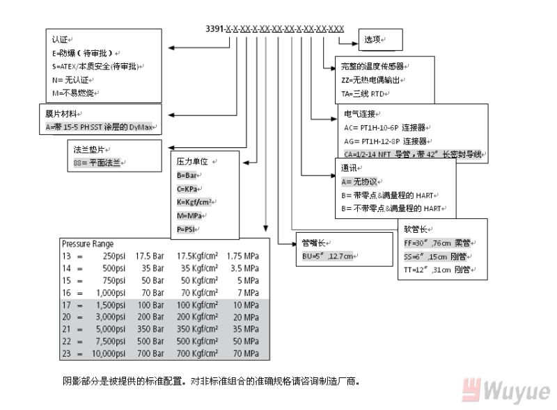 輸出,模擬:4-20mA(標(biāo)準(zhǔn)壓力,溫度可選) 輸出,數(shù)字:HART 綜合精度(錯誤)(20-100%滿量程): ±0.15%滿量程(3M和3M以上) +0.25%滿量程(1.5M和1.5以下) 溫度漂移(77-572℉,25-300℃):0.001%滿量程/℉,最大(0.001%滿量程/℃,最大) 重復(fù)性:±0.1%滿量程 爆破額定壓力:2X滿量程 超壓 額定:1.5X滿量程 量程:1,500至10,000psi 可調(diào)范圍:6:1調(diào)節(jié)比,向下 負(fù)載電阻:250歐姆@18Vdc;500歐姆@23Vdc |