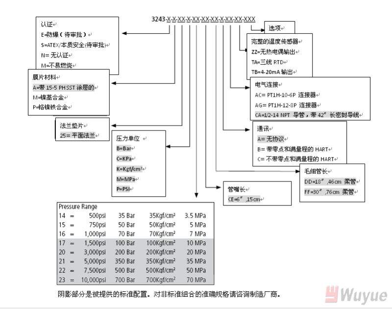 輸出,模擬:4-20mA(標(biāo)準(zhǔn)壓力,溫度可選) 輸出,數(shù)字:HART 綜合精度(錯誤)(20-100%滿量程): ±0.25%滿量程(3M和3M以上) +0.35%滿量程(1.5M和1.5以下) 溫度漂移(77-572℉,25-300℃):0.001%滿量程/℉,最大(0.001%滿量程/℃,最大) 重復(fù)性:±0.1%滿量程 爆破額定壓力:2X滿量程 超壓額定:1.5X滿量程 量程:1,500至10,000psi 可調(diào)范圍:6:1調(diào)節(jié)比,向下 負(fù)載電阻:250歐姆@18Vdc;500歐姆@23Vdc |